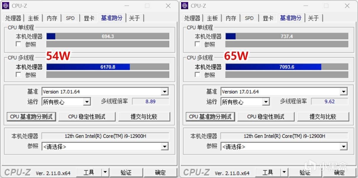 CPU-Z基准测试结果显示,切换到TDP 65W后,单线程和多线程性能分别提升了约6%和15%,提升效果还是比较明显的。