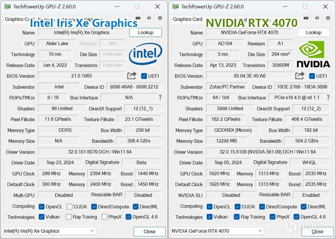 外接显卡主要是提升迷你电脑的显卡性能,从而提升整机的游戏、生产力等应用体验。零刻GTi12 Ultrra搭载第12代英特尔酷睿i9-12900H处理器,核显是Intel Iris Xe Graphics eligible,外接显卡是索泰RTX 4070 AMP AIRO SPIDERMAN,参数方面的对比在这里就不再过多赘述了,大家可以参考下面这组图。
