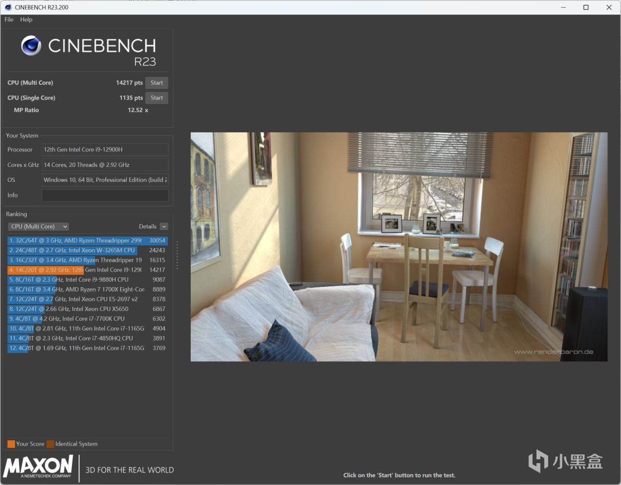 Cinebench R23测试结果,单线程得分1135,多线程得分14217;