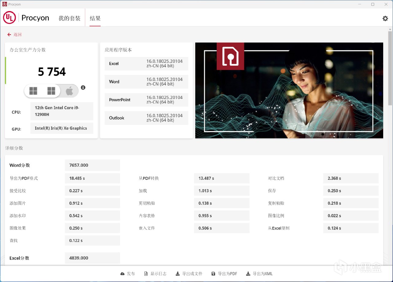 为了获取更精准的生产力表现,我使用UL Procyon对几款典型的Adobe软件进行了更专业的性能测试,通过最后的分数量化电脑在执行编辑、导出任务时速度。