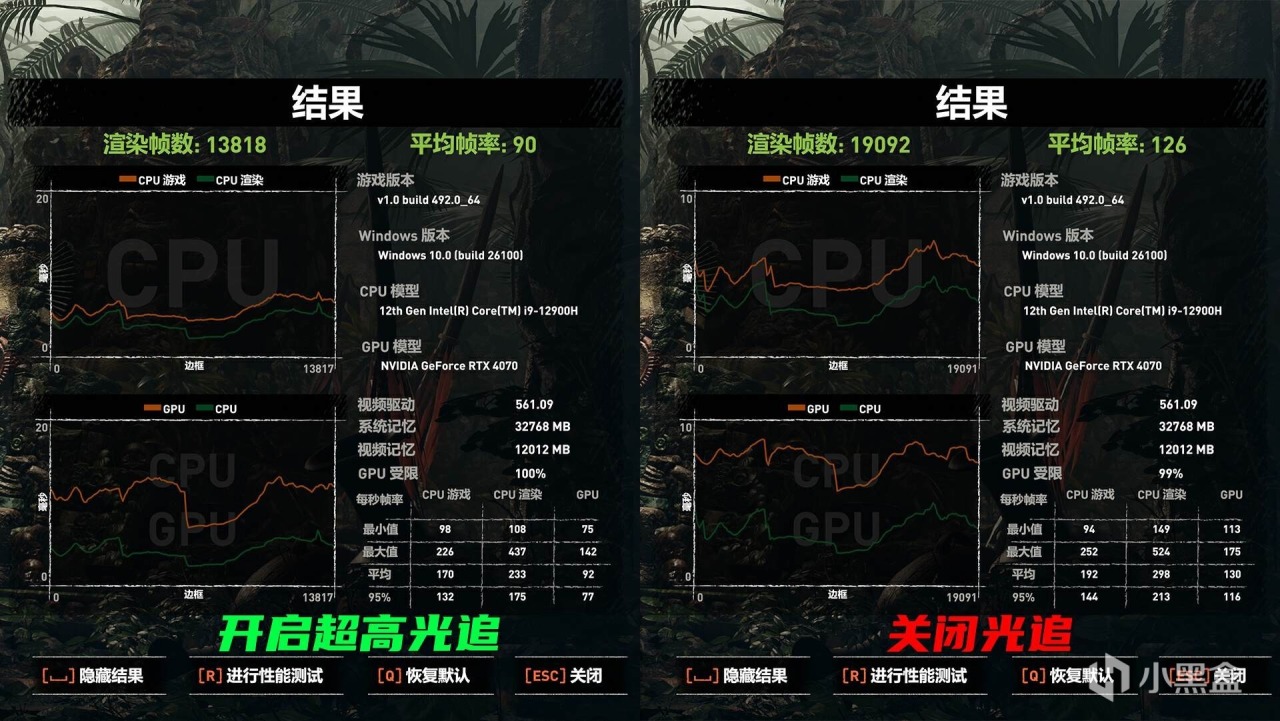 4K分辨率+高画质,开启超高光追,游戏Benchmark测试平均帧率90;关闭光追后,游戏Benchmark测试平均帧率126。