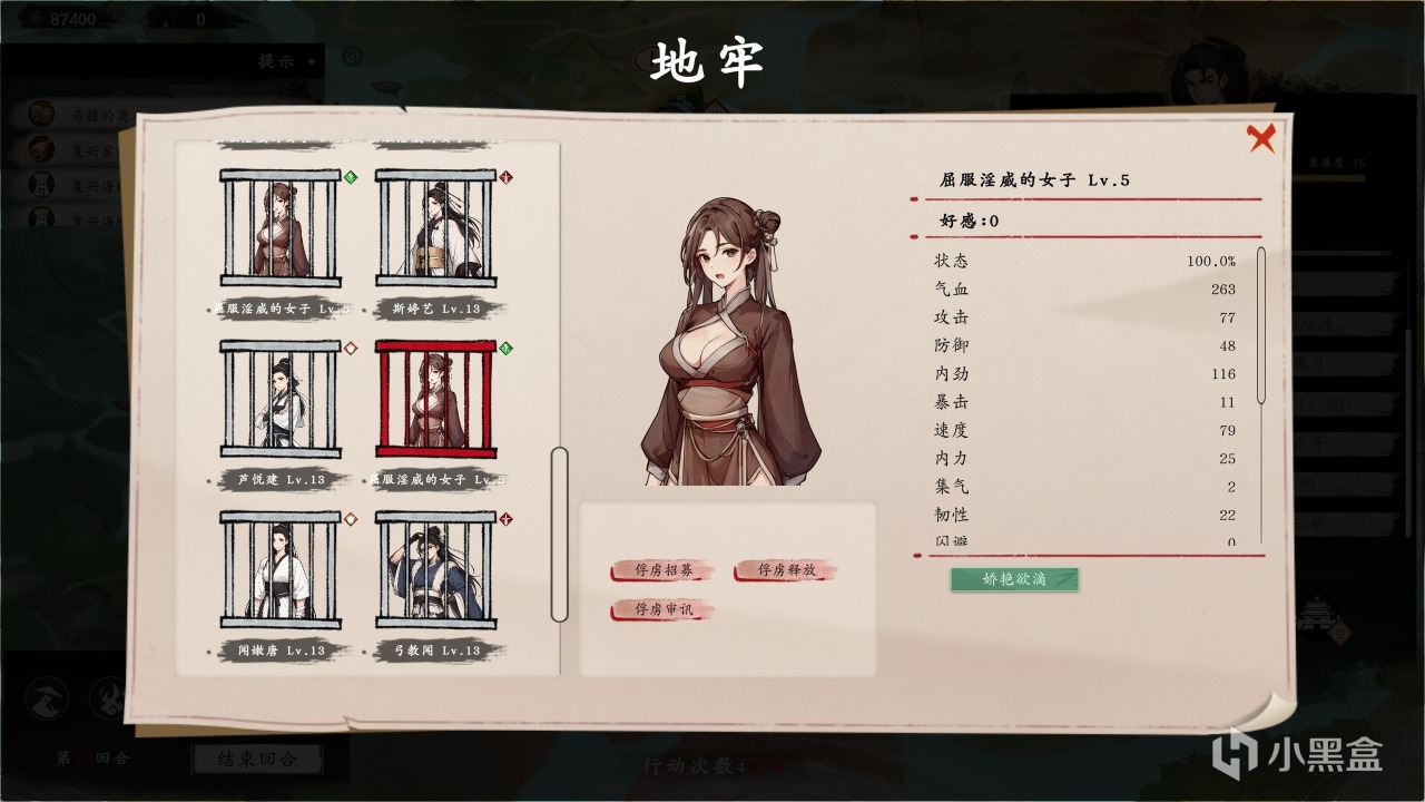BTW:因为本作战斗可以俘虏敌人的门人,放走一次是4好感,10好感是必然可以招募成功,所以你招过来的“囚犯”基本是进队就可以来一次“气运修炼”,优势很大!