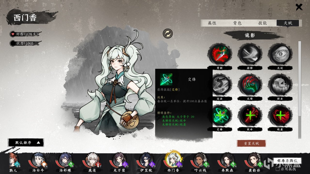 角色可以学习内功、外功和轻功,装备武器、服装和饰品,然后可以吃各种丹药提升属性,这些都比较常规,必过比较特殊的地方在于每个职业都有自己的天赋树,这些天赋搭配特定装备会有奇效。