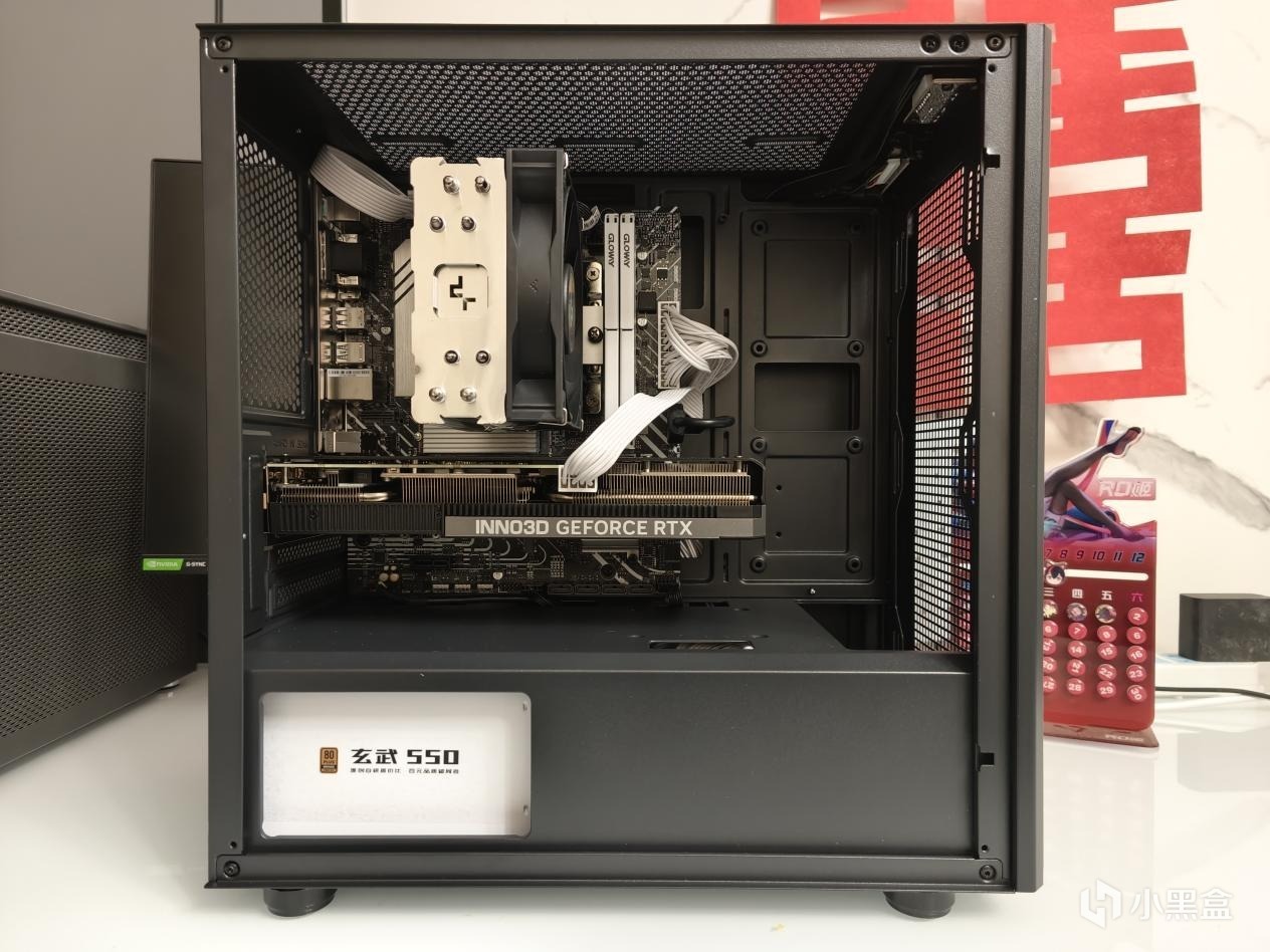 機箱機主自己挑的先馬平頭哥M2 MESH,裝好是這個樣子的,非側透機箱,前臉網孔設計,這樣風道能好點,但是也容易進灰,這配置不熱就沒配機箱風扇。