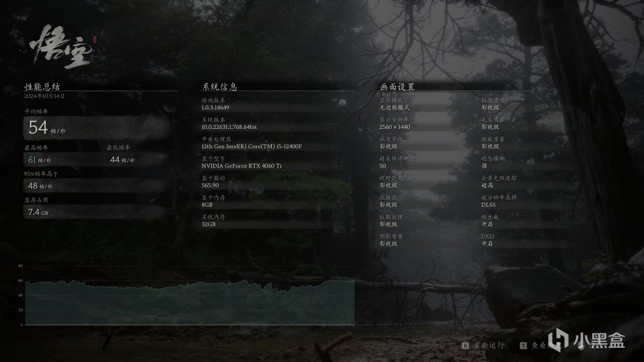 黑神話:悟空 2K分辨率 光追超高+DLSS 50%超採樣+幀生成+全影視級,平均幀數54幀