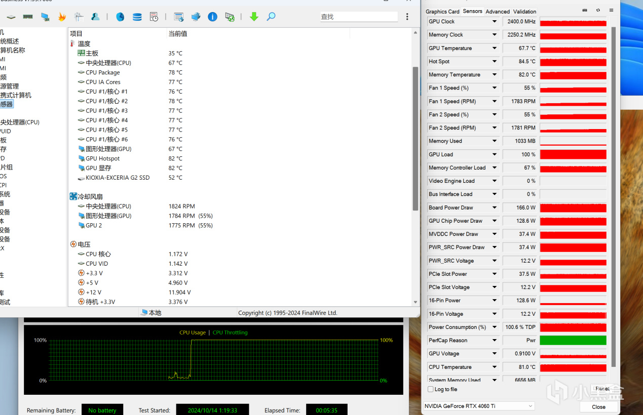 雙烤CPU溫度77℃、顯卡溫度67.7℃,顯卡功耗165W,CPU功耗8W。