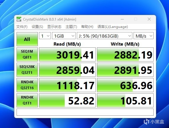 运行CDM,看到顺序读取3019MB/s,写入2882MB/s ,速度是非常的快。