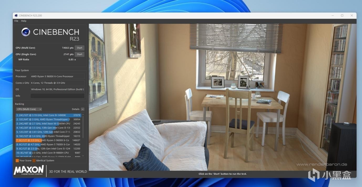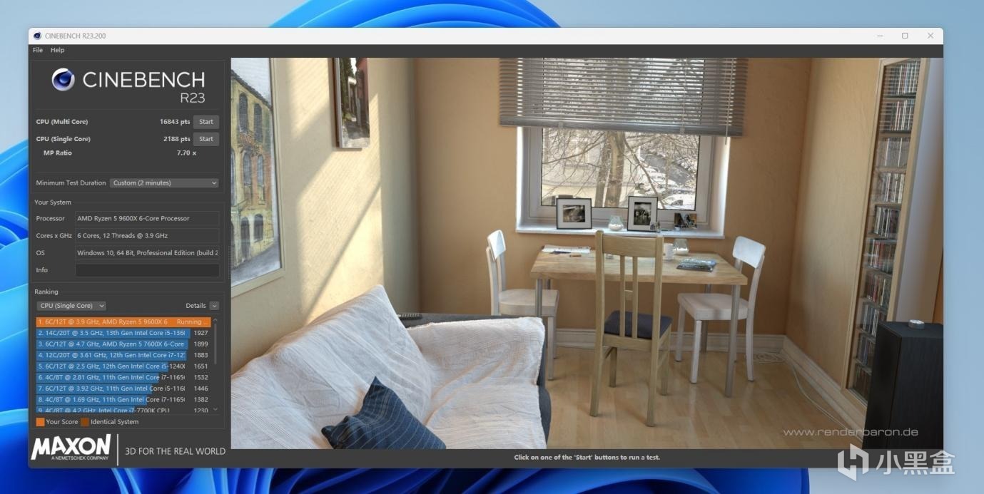 CINBENCH R23测试,超频前是多核14663,单核2141,超频后是多核16843,2188。