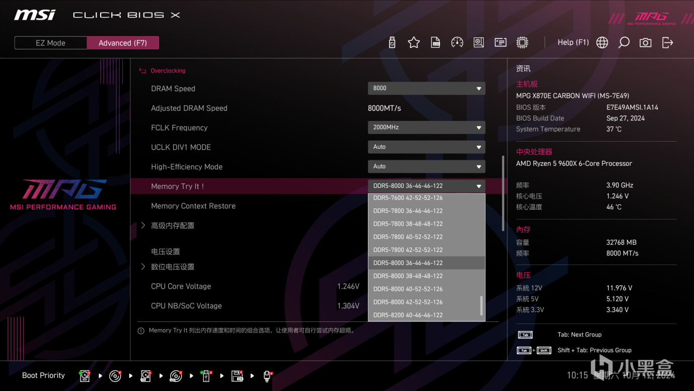 这款的BIOS界面也十分清晰,分为简易模式和高级模式,十分好用。我们看这里内存是超频到了8000MHz,同时,左侧CPU有个加强的符号,可以一健增强。