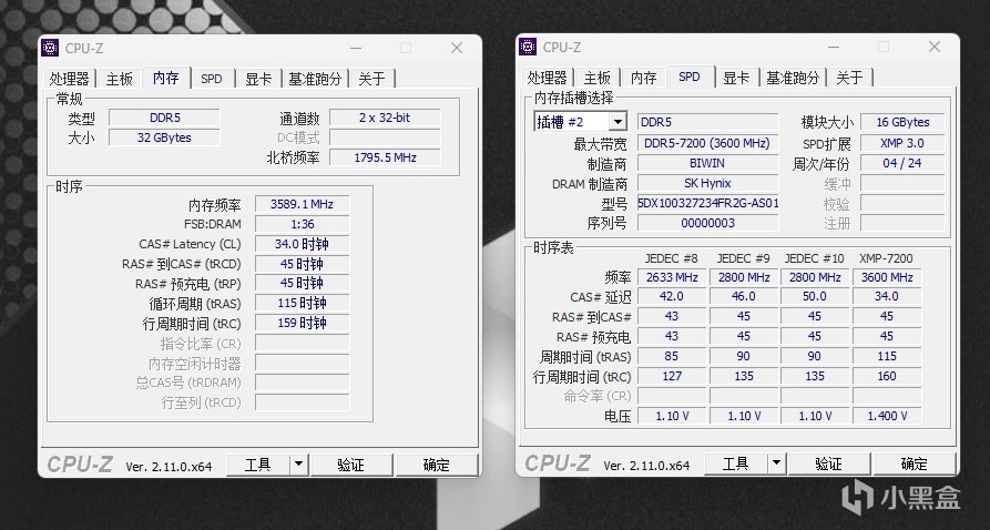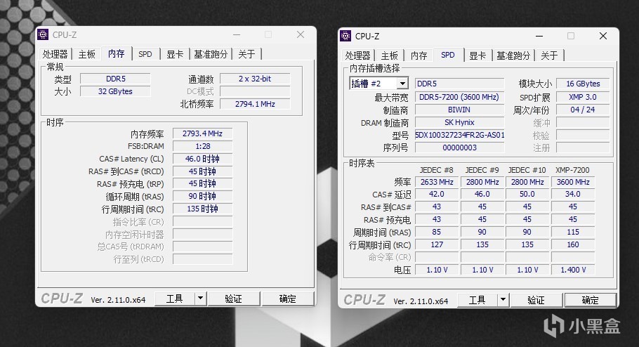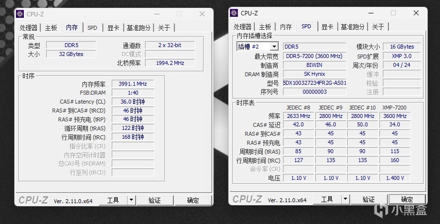 CPU-Z内存,我们看SPD是佰维,颗粒是海力士。默频5600MHz,时序46-45-45-90;XMP7200MHz,时序34-45-45-115。最后一个图片,我们成功超频到了8000MHz,时序36-46-46-122。无论是XMP还是一键超频,这些时序参数都是主板自动配置的,我们不懂也没有关系。
