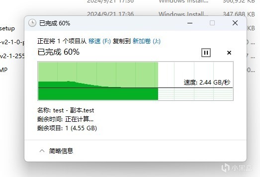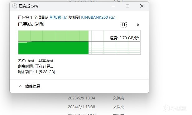 从硬盘盒读取12GB大文件到电脑内置硬盘,速度接近3GB/s,非常的快了,稍微慢一点截图都截不到。