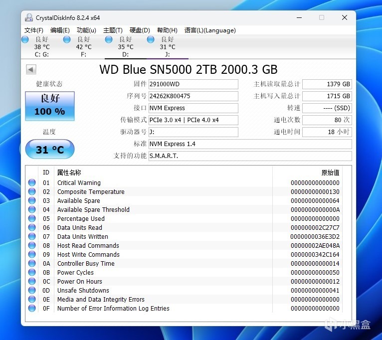 进入系统,运行CDI,直接识别为硬盘,传输模式PCIe 4.0x4。温度仅仅31度,很凉爽。