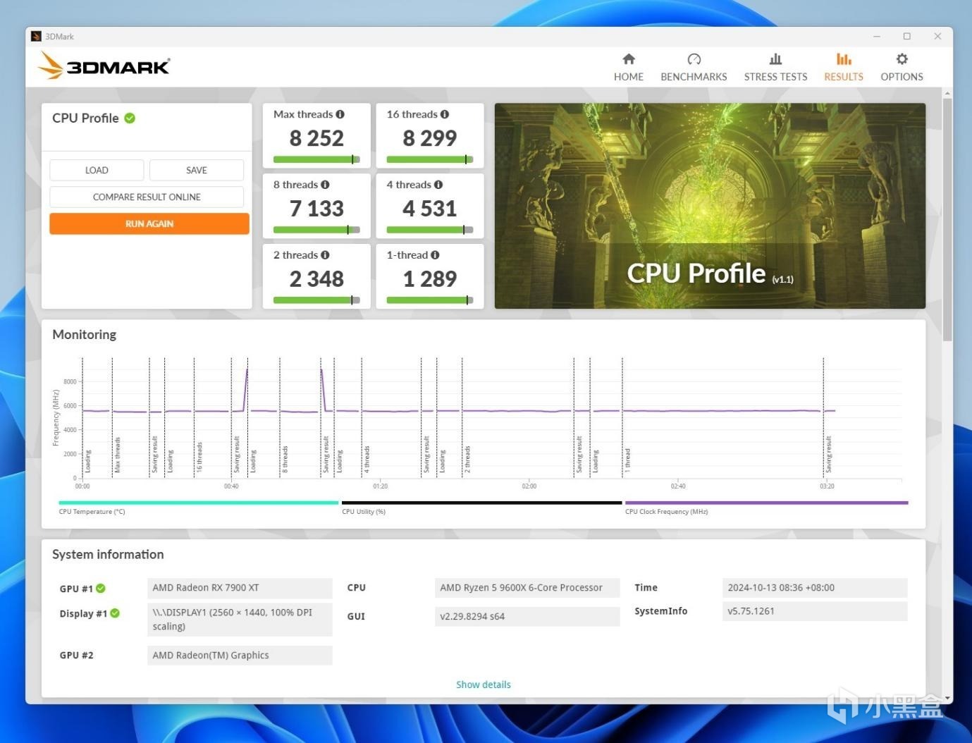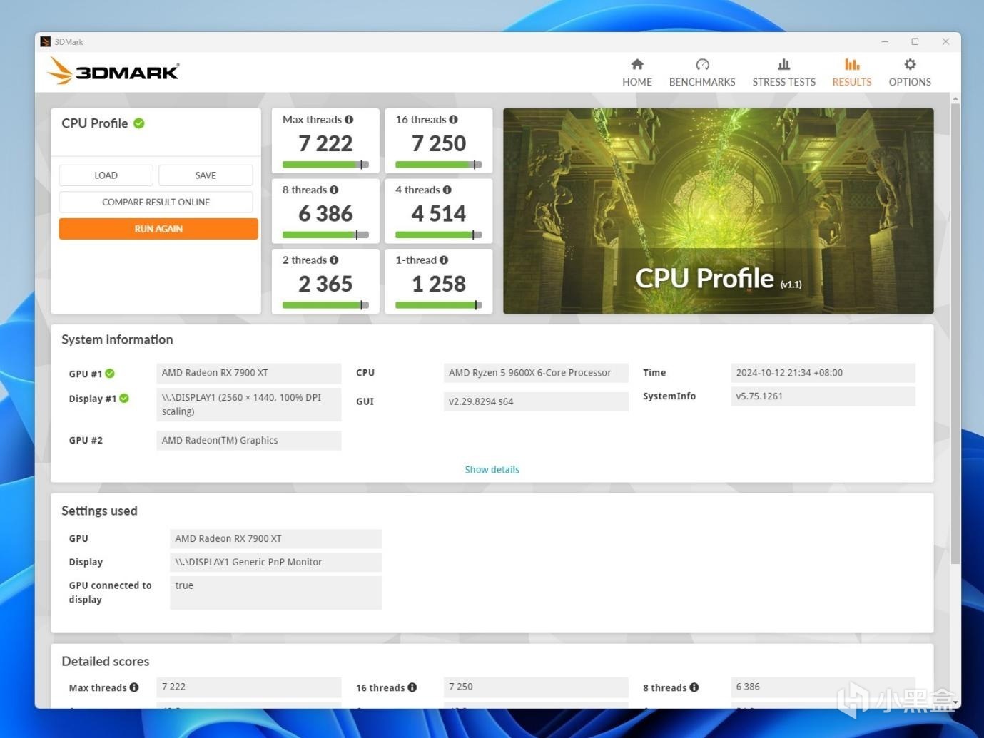 3DMARK CPU Profile测试,CPU超频前单线程1258,最大线程7222,超频后单线程1289,最大线程8252。同样提升不少。
