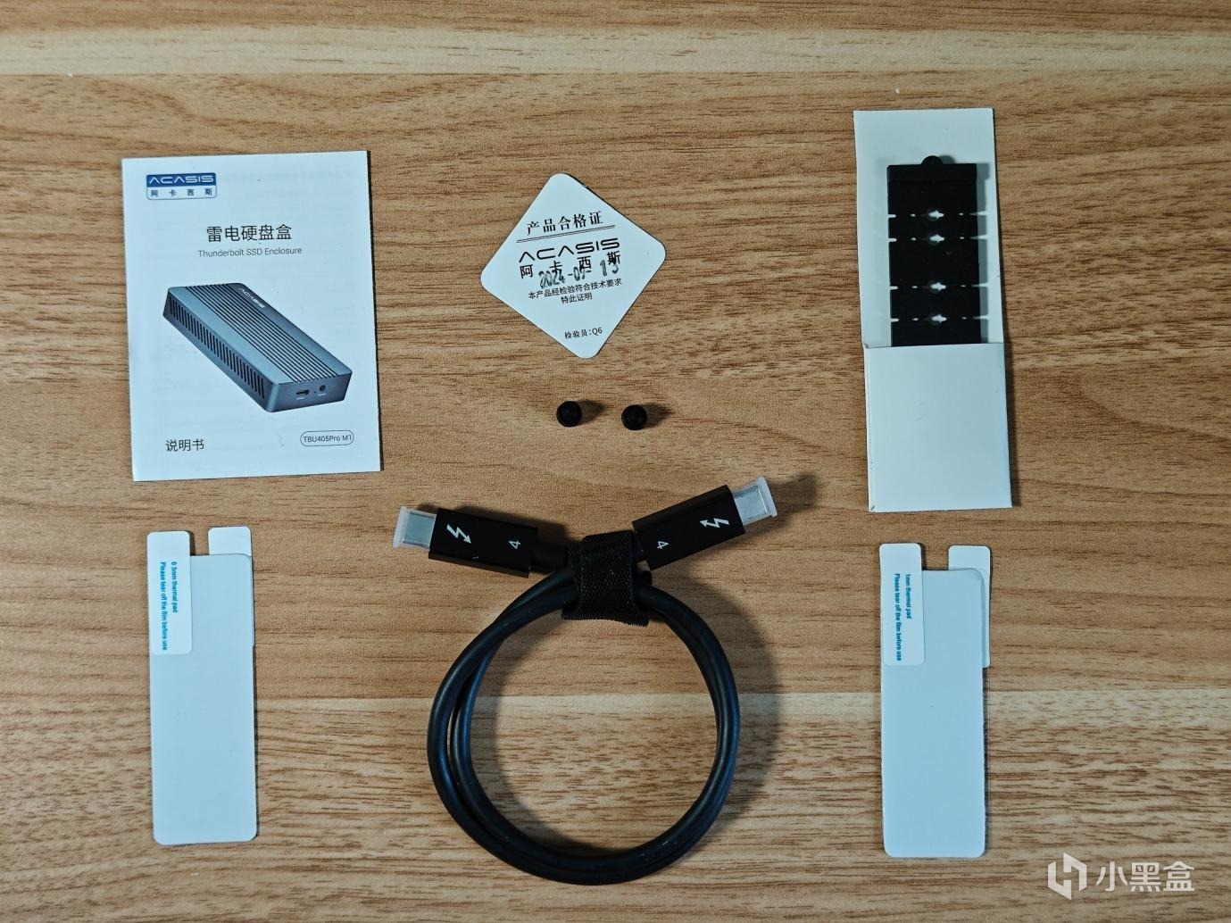 配件很多,说明书、合格证,散热硅胶垫,50cm的支持雷电4的通讯线。那个像手表带一样的的东西,哦,是用于短硬盘延长用的。