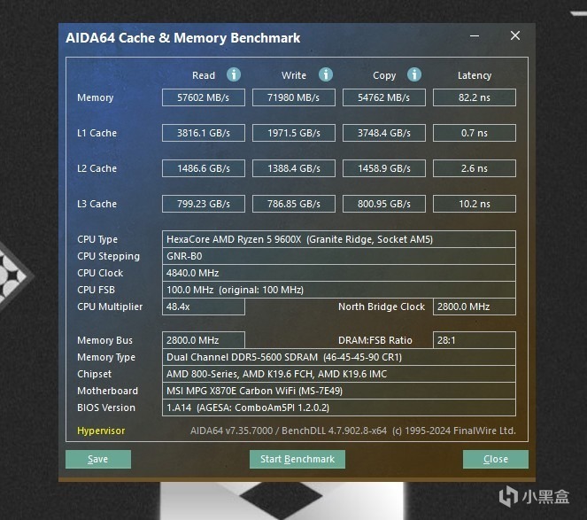 AIDA64内存测试,默频5600MHz下,读取57602MB/s,写入71980MB/s,复制54762MB/s,延迟82.2ns。