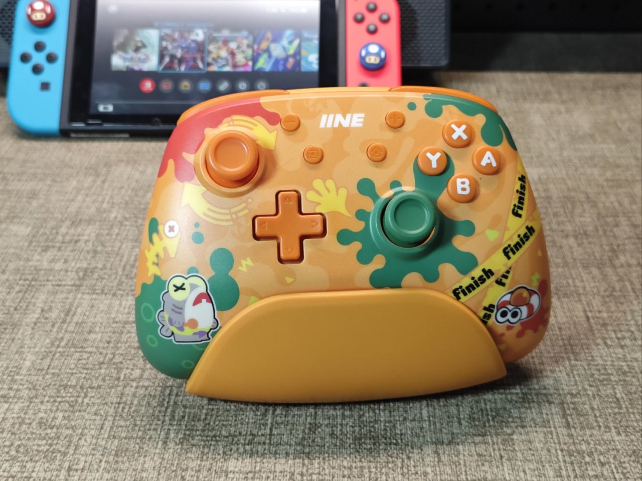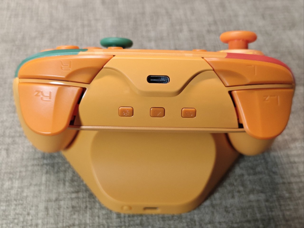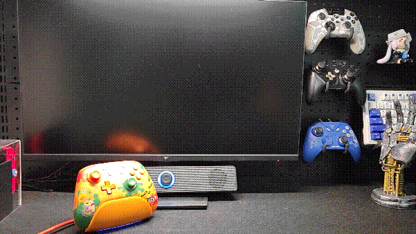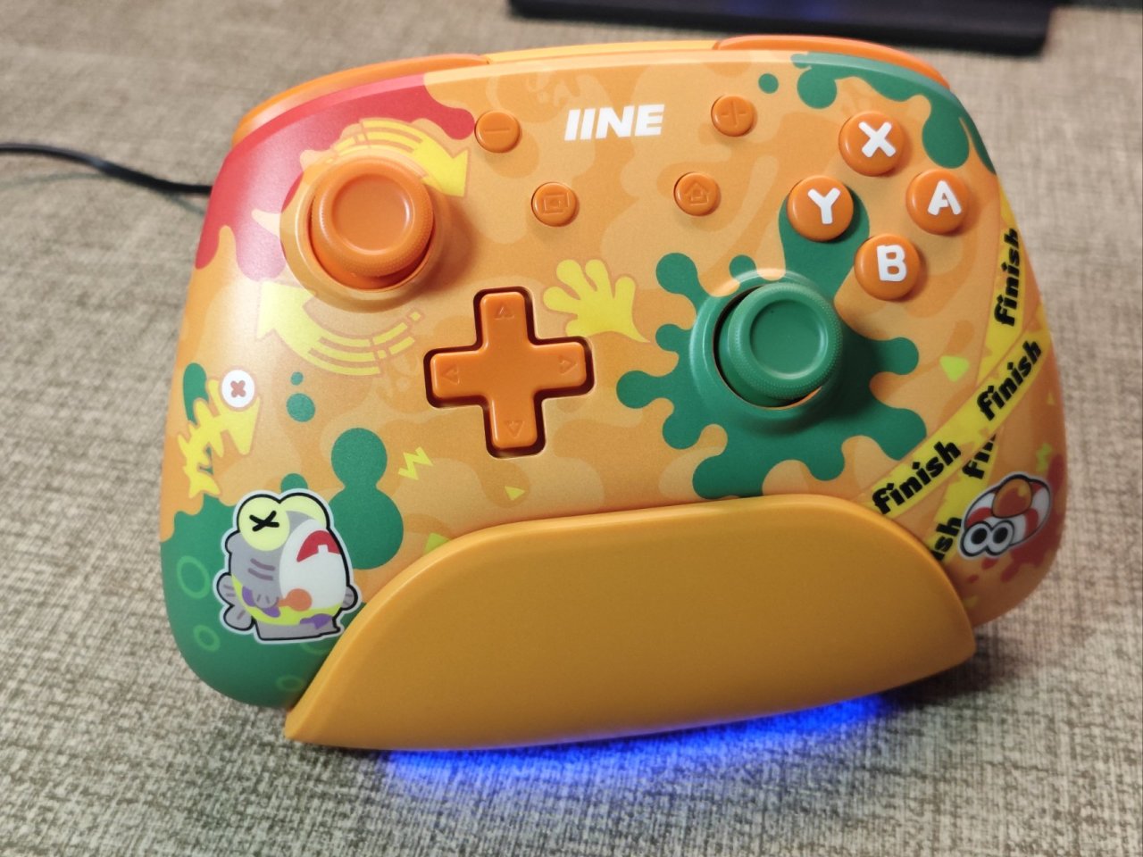 手柄還有個非常實用的智能底座,底座整個是橙色配色。底部做有一條燈帶,不過只有單色藍光有點可惜。他做有一圈非常大的防滑底墊,並且底部有個隱藏的拓展HUB口。這個底座真的非常方便,除了能給手柄充電外,他還支持智能啓停。在switch鎖屏幕狀態下拿起手柄會自動喚醒switch,而且他喚醒switch的時間也非常快。我實際測試的數據約爲四秒。