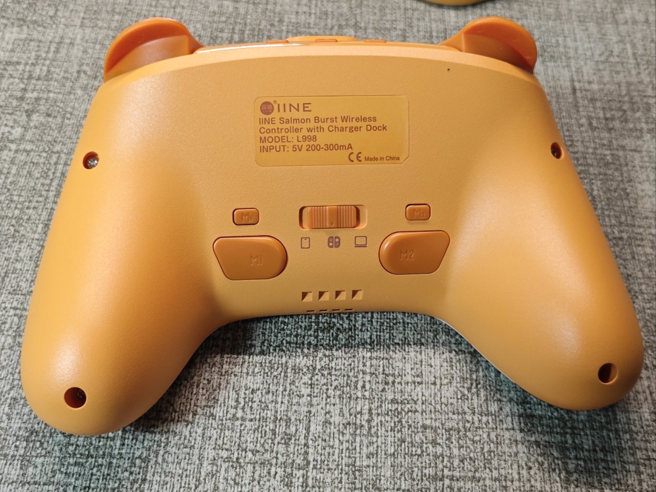 手柄的背面設有m1、m2兩顆拓展鍵,案件爲輕觸開關,並且在他們正上方都有一顆對應的小按鍵,通過這個按鍵,可以快速設置背鍵的宏功能,非常貼心。不過需要吐槽的是,他這個案件做的比較硬,並且比較平,手指搭上去之後,剛好是中指的指壁,而非指腹,按久了有點累。居中位置是手柄的平臺切換開關,除了switch外,手柄還支持PC,安卓及iOS平臺。正下方位置爲四顆金屬觸點,方便底座充電,再下方位置則爲手柄的狀態連接指示的。