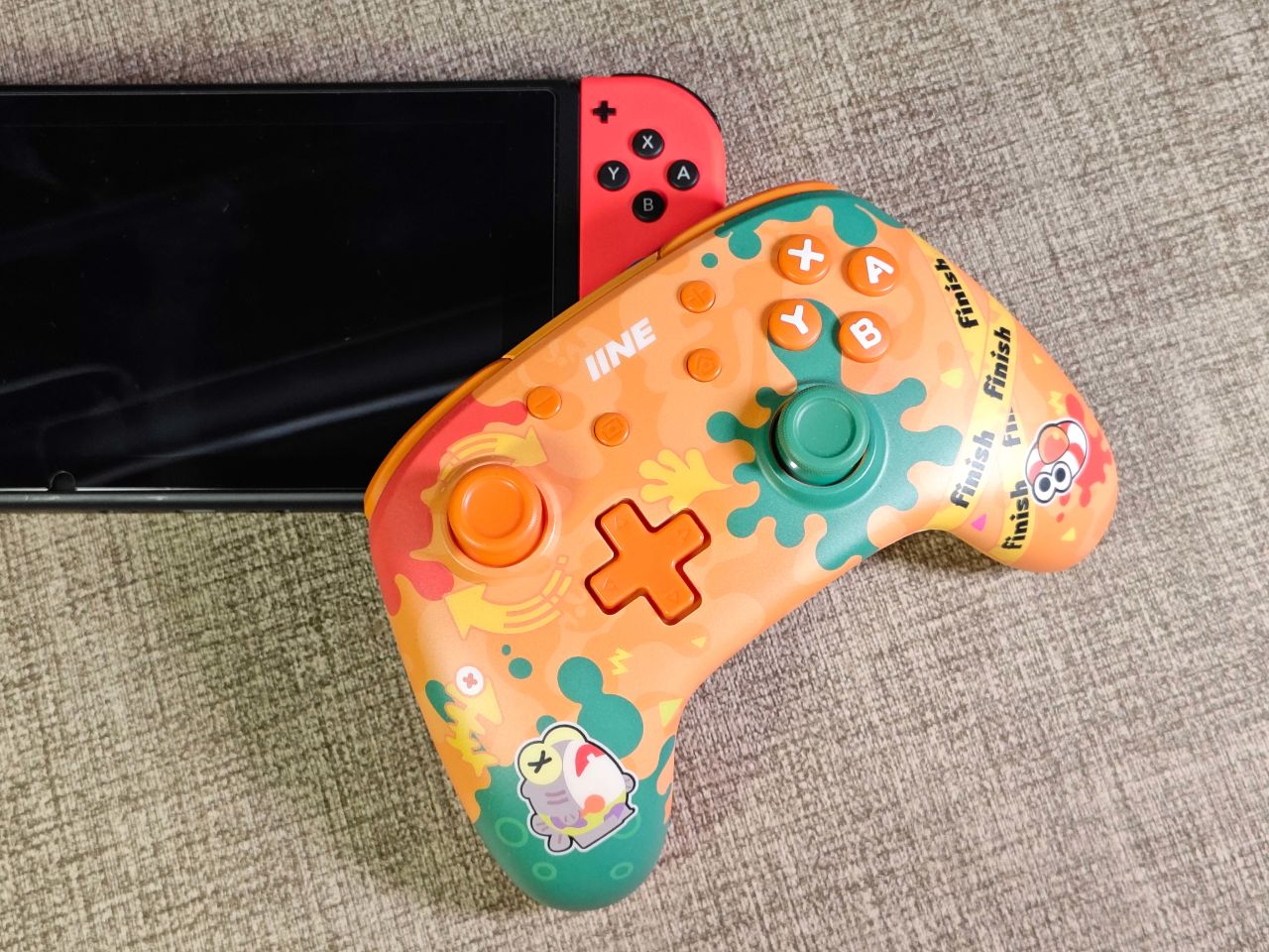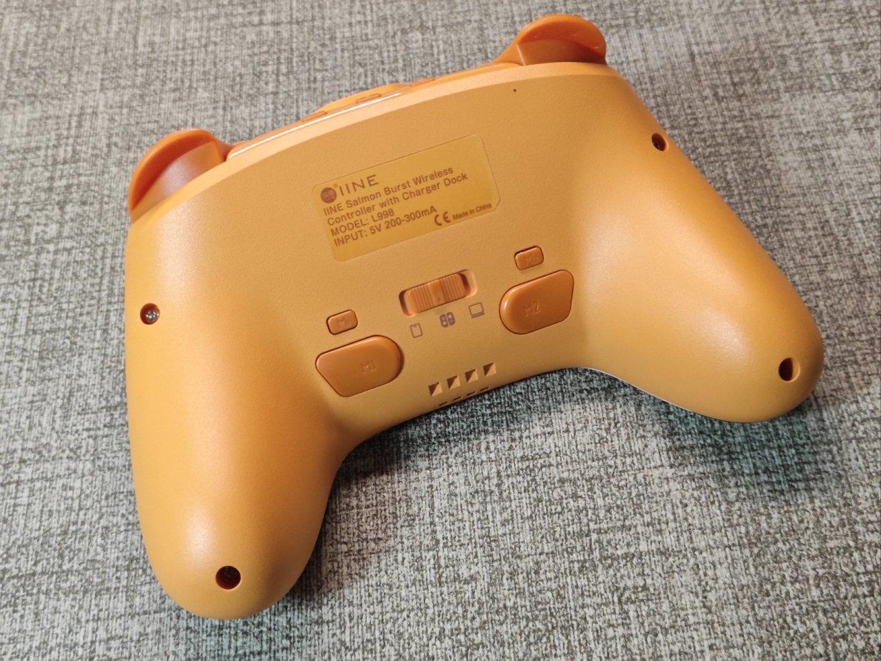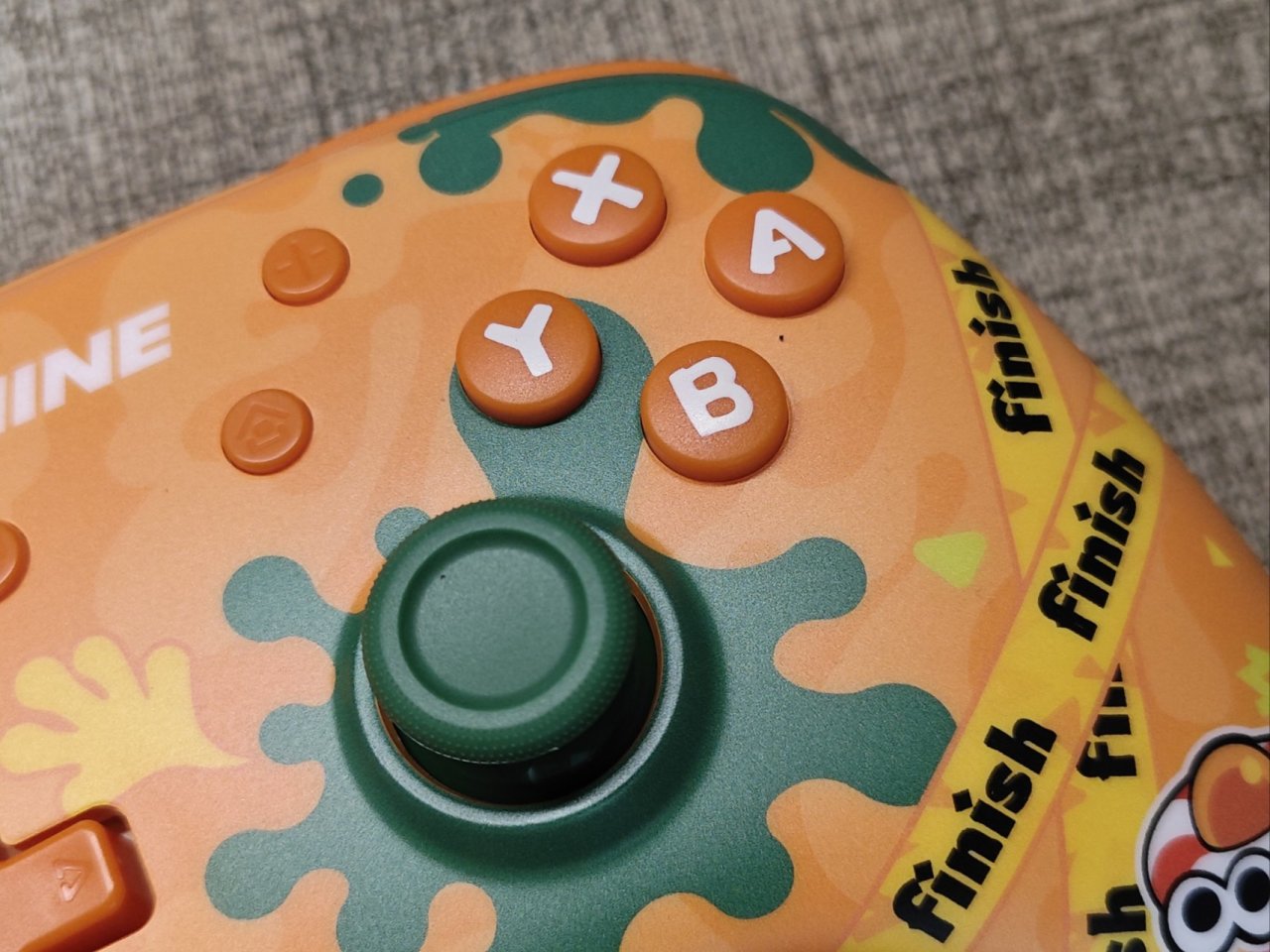 然後來到大家最關心的手柄本體部分,手柄整機採用橙色配色,正面圖案採用IML工藝,保證了圖案色彩的高還原。面殼表面附有PET磨砂膜片,觸摸手感非常溫潤順滑,圖案用久也不掉色。他這個圖案設計懂的都懂,不過真的好看也是事實,是否喜歡就因人而異了。