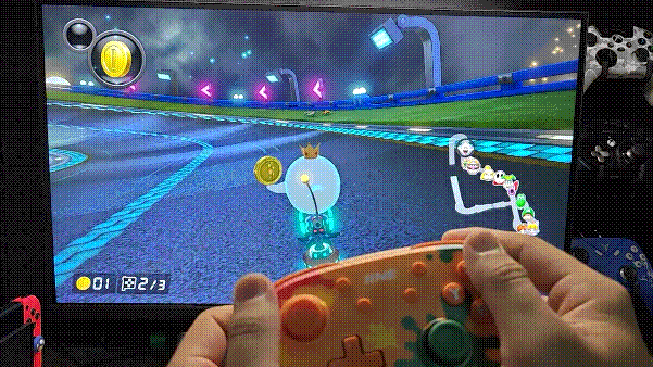 而且作爲一款NS手柄,體感功能也是必須具備的,它的體感功能做得非常不錯,延遲很低,控制靈敏。如圖所示,我在開啓體感模式後用他玩馬8,能看到他的轉彎是跟我手柄實時對應的。當然,手柄也是支持震動的,不過可惜的是,這款手柄並未上HD震動,而是採用非對稱轉子馬達。