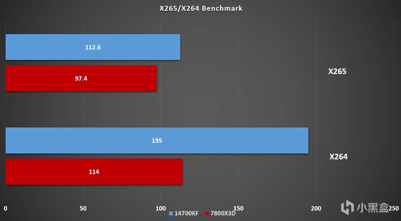 在X265编码中7800X3D的性能没有落后i7-14700KF太多,在X264的测试中i7-14700KF又是领先了将近1倍。可见7800X3D在视频压缩方面还是远远不如i7-14700KF。