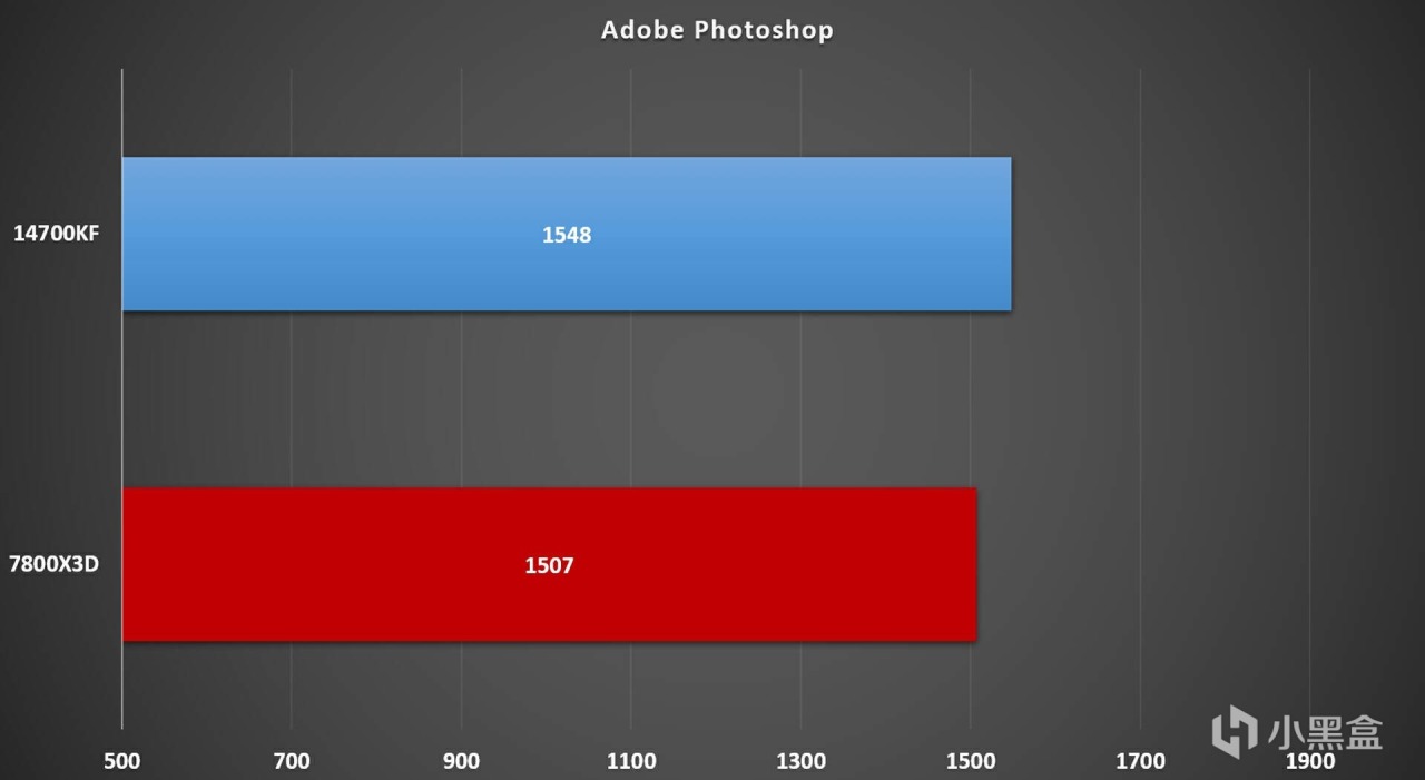 通过 Puget Bench的Photoshop测试,7800X3D得分约为1507,14700KF的得分约为1548,两颗CPU的差距表明14700KF在Photoshop图像测试中有更好的性能表现。