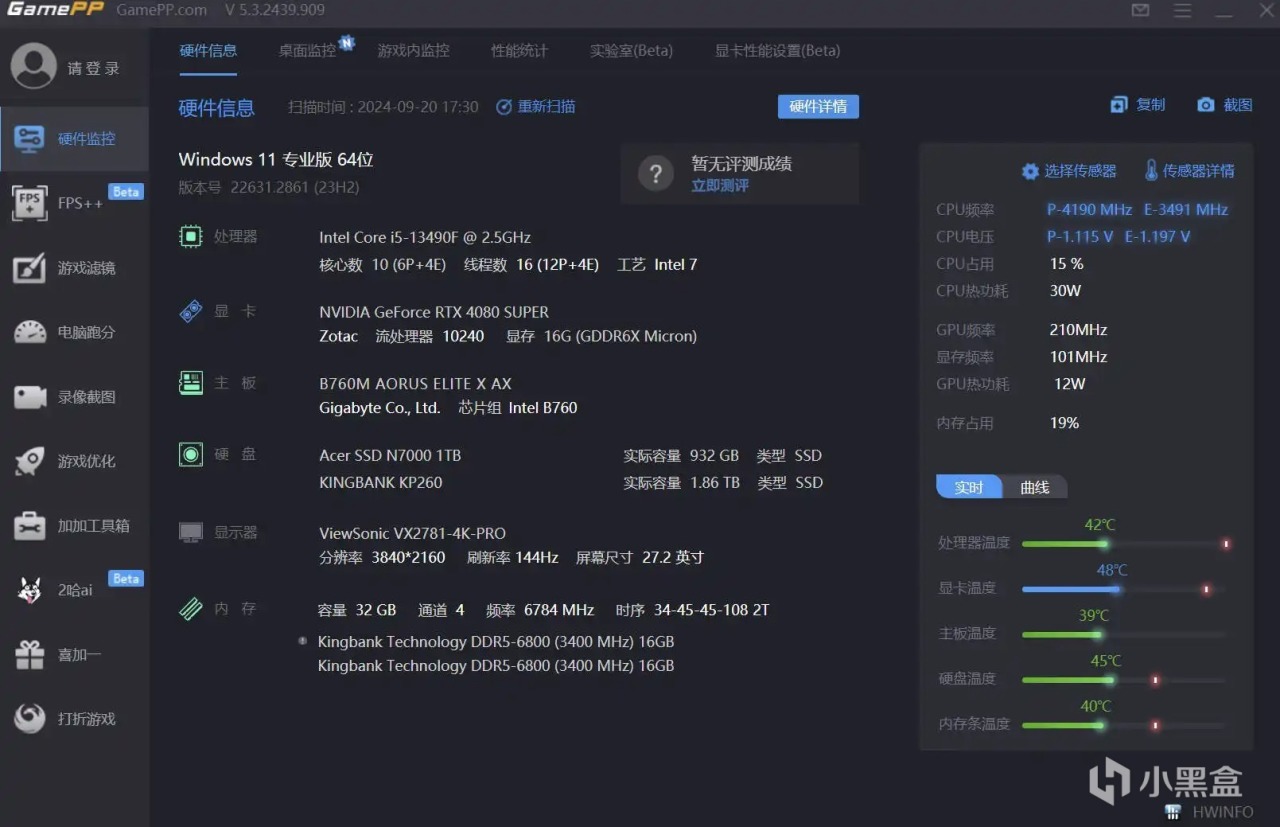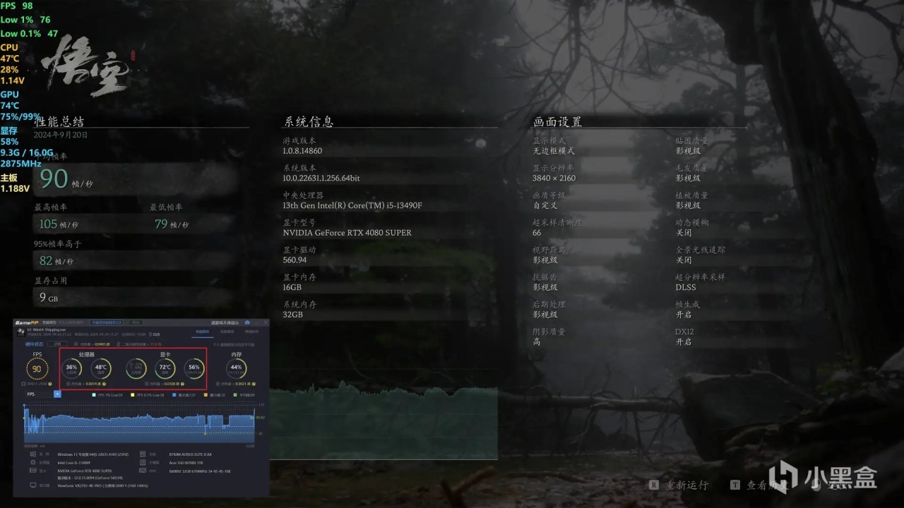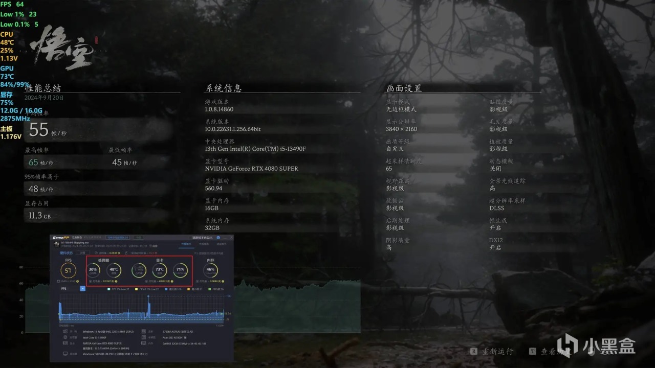 首先還是來看看最近大火的黑神話.悟空吧。講真,遊科對遊戲的優化是真的給力,低端顯卡也能保持很好的遊戲體驗。本次我分別測試了 4K 分辨率性能 + 畫質兩套設置,看看 13490F 能不能餵飽 4080S。