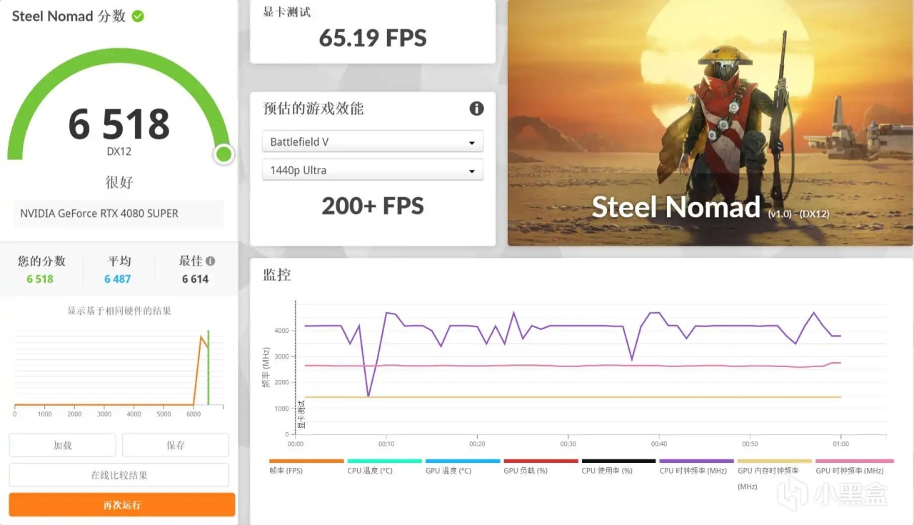 ▼ 3D Mark 中的 Steel Nomad 主打跨平臺測試,因爲不支持光追效果,比較容易判斷處理器對顯卡的制約程度,實測下來得分 6518分