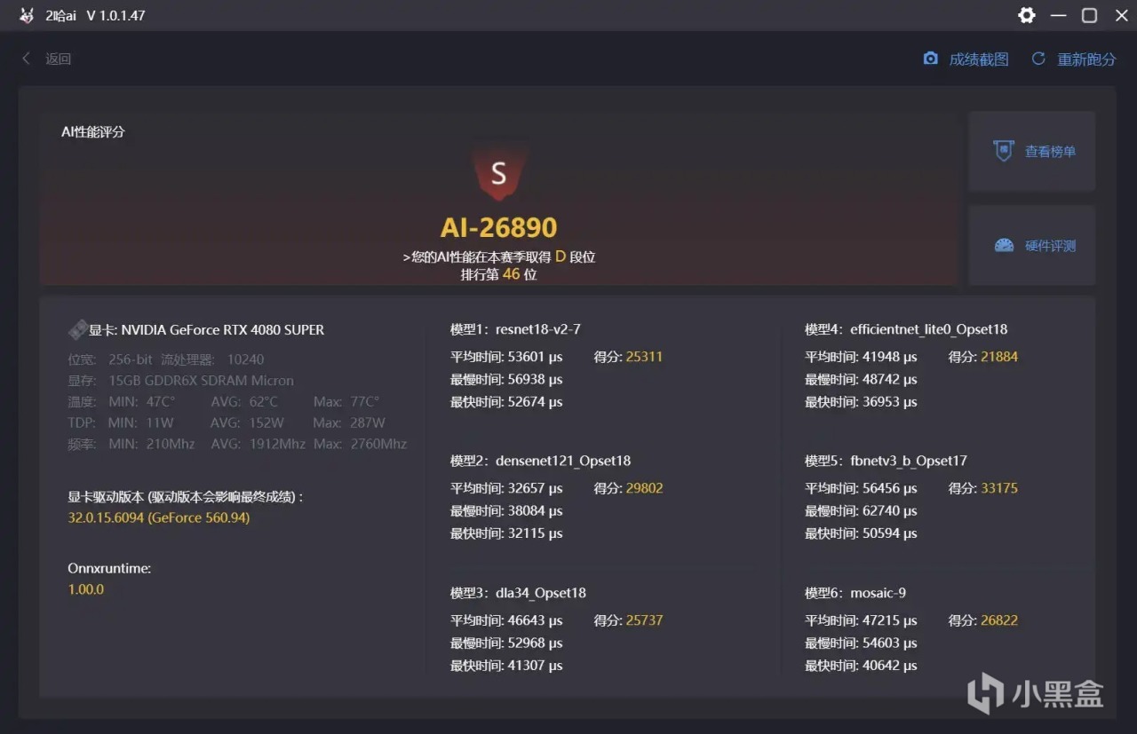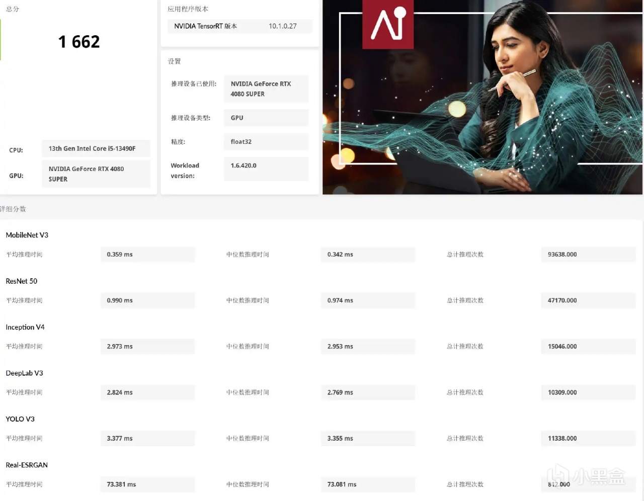 ▼生產力方面,人工智能 AI 發展的如火如荼,其使用場景也是越來越普適。不過玩 AI 對加速環境要求較高,顯卡的好壞更是和效率息息相關,因此衆多測試軟件也開始加入了 AI 測試,首先來看看遊戲加加 AI 平均得分 26890,不同模型得分參考下圖