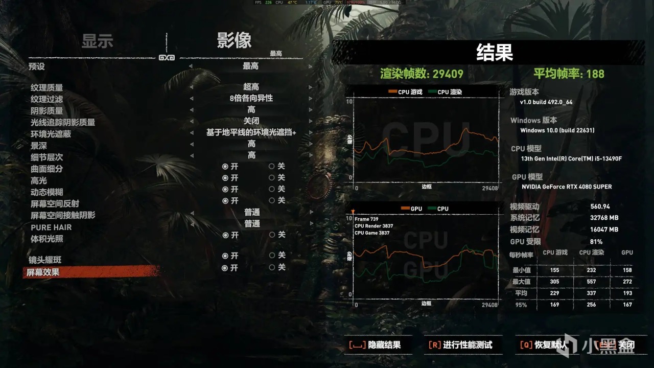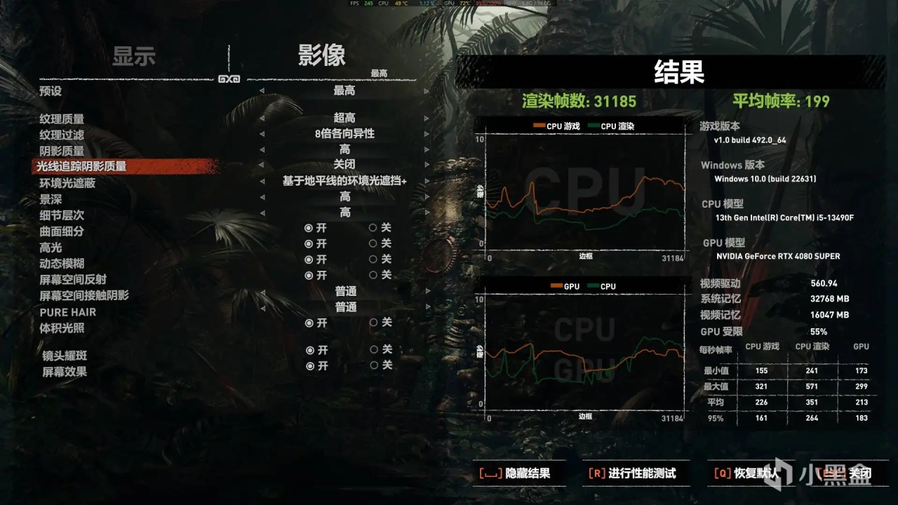▼再來看看古墓麗影暗影的測試結果,這遊戲雖然上市有點年頭,但詳細的 Benchmark 工具,對於判斷主機性能還是很實用的,尤其是 CPU 對顯卡性能釋放的影響詳細數據,很適合作爲處理器性能測試。從結果來看,在 4K + DLSS平衡 + 最高畫質下主機能跑出 199FPS 平均幀率,受限率僅僅 55%。