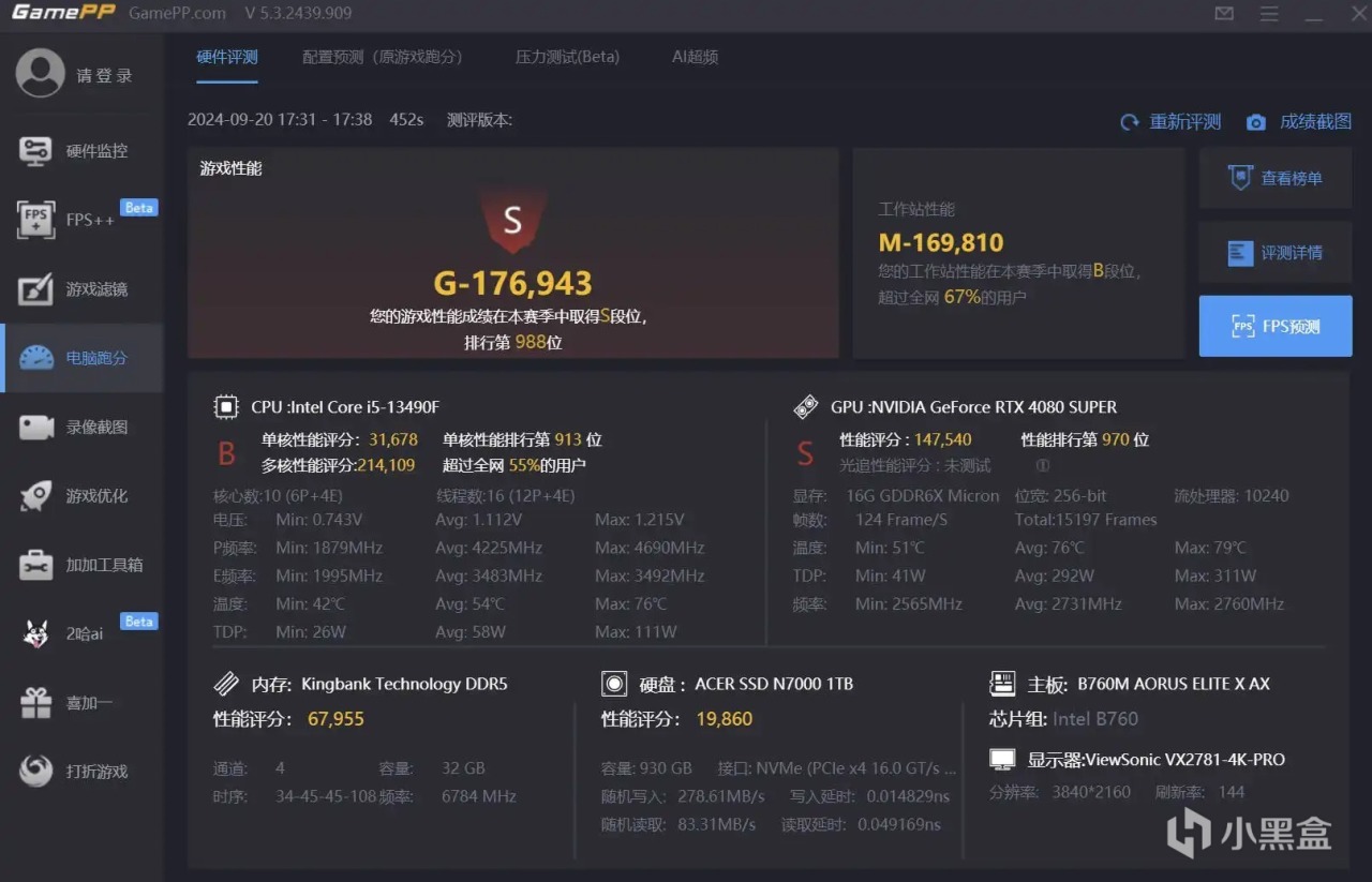 作爲對比,14700KF 平臺索泰 RTX 4080 得分爲 148380,看似有 千元差距,實際上兩者跑分相差不大,畢竟還存在遊戲加加版本號不同的差異。