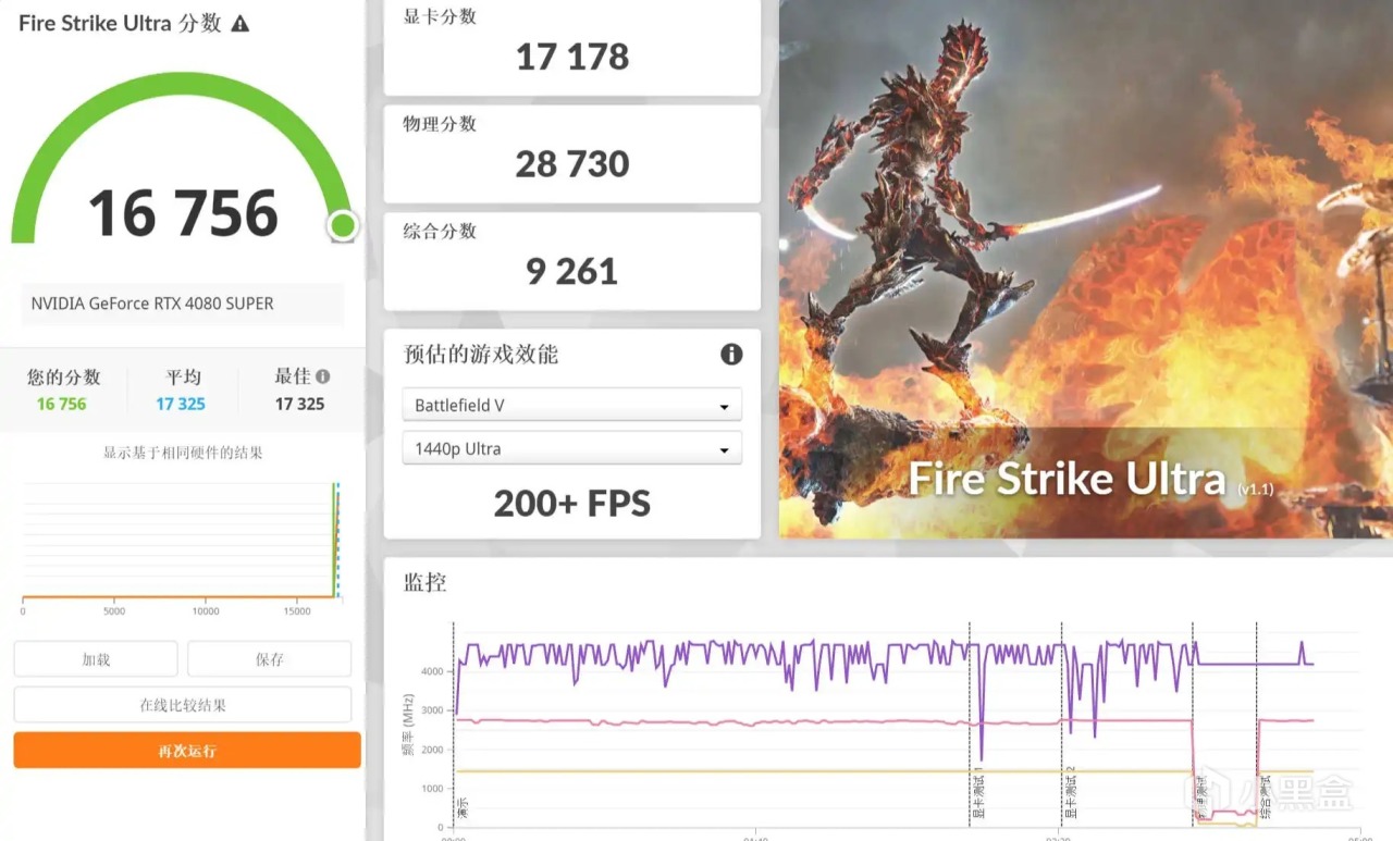 ▼3D Mark Fire Strike,這是一項適用於高性能遊戲電腦和超頻系統的 DirectX 11 基準測試,其統 一 的打分機制對於不同設備的性能比較很有參考,Ultra 版則是該測試的 4K 版。實測下來整機總得分爲 16756分,其中顯卡分數 17178分。