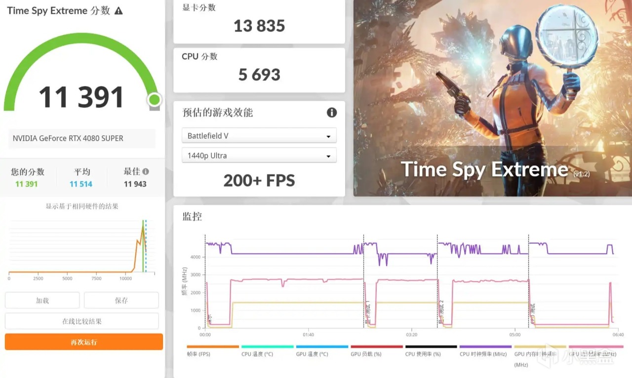 ▼Time Spy Extreme 是針對 DirectX 12 遊戲設計的基準測試,看重的是 4K 分辨率下 DirectX 12 的遊戲性能測試,支持原生 API 功能,比如如異步計算,多顯卡適配器技術和多線程。實測下來整機得分爲 11391 分,其中顯卡分數爲 13835分