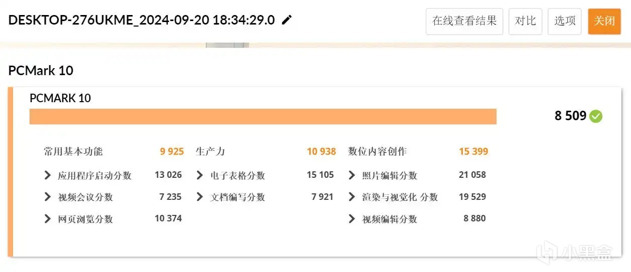 ▼首先是模擬家用和辦公場景的 PCMark10,總分 8509,基本功能 9925、生產力 10938、數位內容創作 15399.
