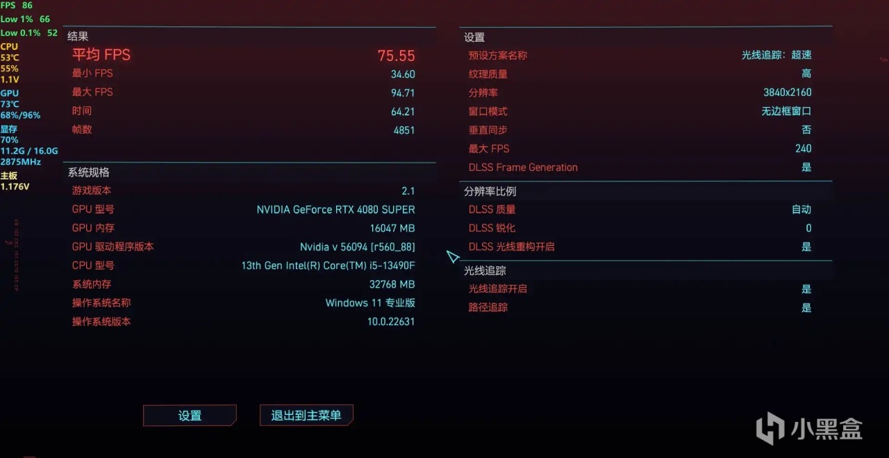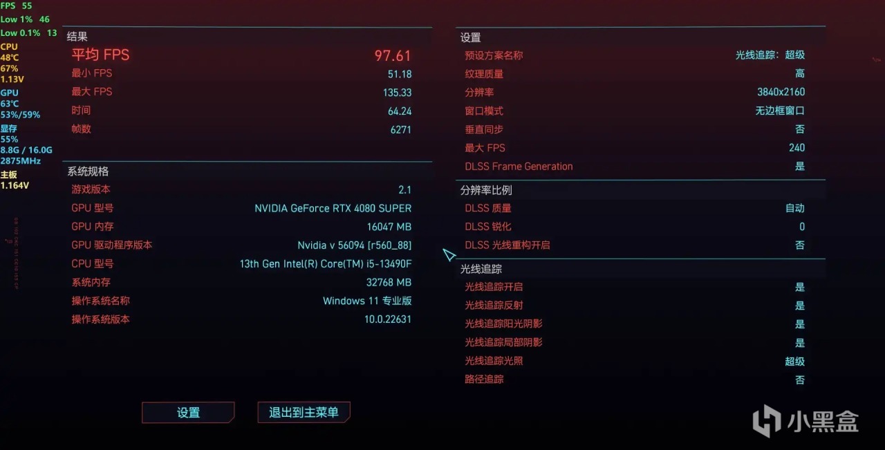 ▼再來看看賽博 2077的表現,這遊戲雖然也喫顯卡,但對處理器的要求更高。比較難得的是,這遊戲是少有的同時支持 INA 三家超分辨率技術,以及光追與 DLSS 3 技術的單機大作。本次測試基於 4K 分辨率 + 預設光線追蹤:超級,平均幀率達到 97.61FPS,最小幀率 51.18FPS,1%Low 幀率 46FPS,不過此時 CPU 和 GPU 的佔用率分別爲 70% 和 80%,都沒有達到兩者極限。