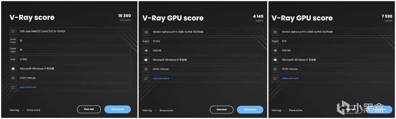 測試結果如下: V-Ray 得分爲 16360分, V-Ray GPU CUDA 得分爲 4149 分, V-Ray GPU RTX 得分爲 7598 分。