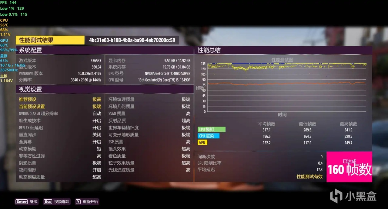 ▼地平線5 性能測試,4K 分辨率 + 極端特效 ,平均幀數 160FPS,1%Low 幀率 129FPS, GPU 佔用 100%,CPU 佔用 65% ~ 70%,13490F 完全釋放 4080S 的潛力
