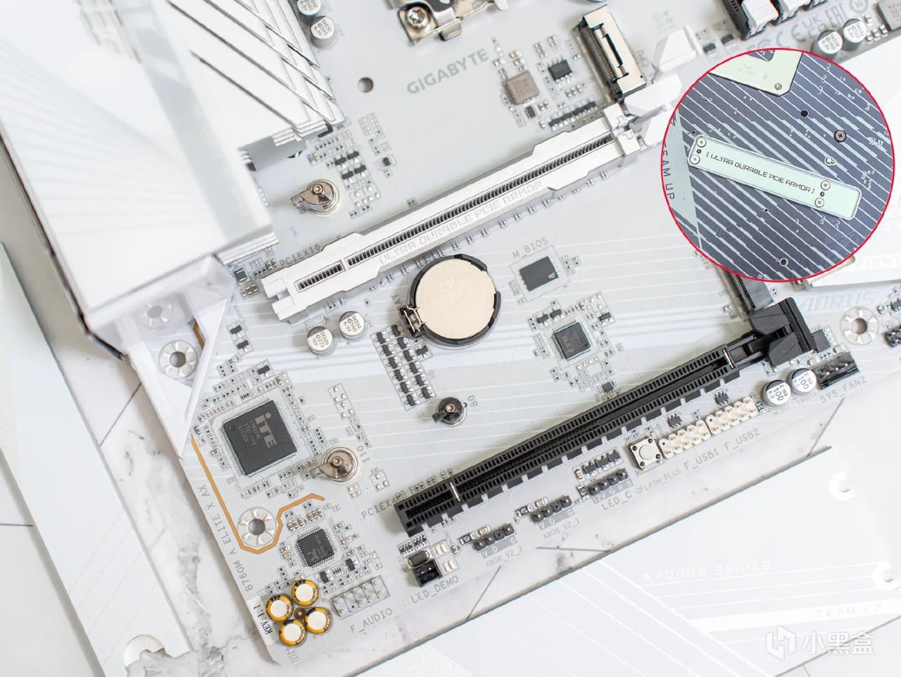 ▼主板配備了兩個 PCIe 4.0 x4 M.2 插槽,每個插槽都配有散熱裝甲,以確保高效的熱管理。插槽支持 EZ-Latch Plus 快速裝卸技術,只需輕鬆一撥,用戶便可方便地安裝或拆卸 M.2 固態硬盤及其散熱裝甲,大大提升了使用便捷性。 PCIe 5.0 插槽同樣安排了兩根,第 一 根爲 PCIe 5.0 * 16通道直連 CPU,全包覆式不鏽鋼加固設計,可以有效減輕顯卡對主板的壓力,第 二 根全長插槽則是 PCIe 4.0*4 通道。