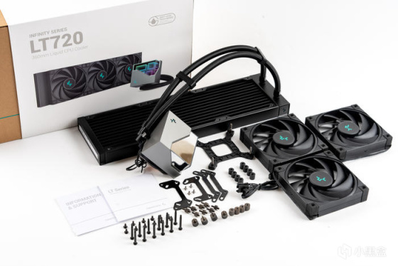 LT720冰魔方的全家福,除了無限鏡冷頭蓋之外都爲全黑配色,全扣具比較齊全支持AM4/AM5和intel 1700以及TR4和20XX扣具,並且使用九州風神最新的FK120風扇,能在2250RPM下可以達到最大風量85.85CFM、風壓3.27mmAq,而運行噪音只有32.9dB(A)