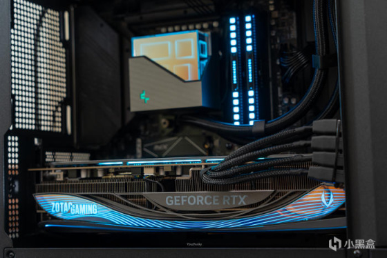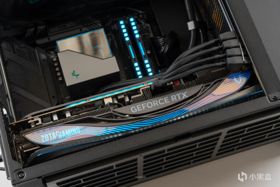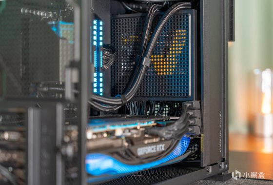 從機箱內部可以看到顯卡已經超過了喬思伯D31電源蓋板,但是得益於振華VG1000W的13CM短身尺寸,讓機箱在支持360水冷的同時還能安裝下4090巨無霸長顯卡