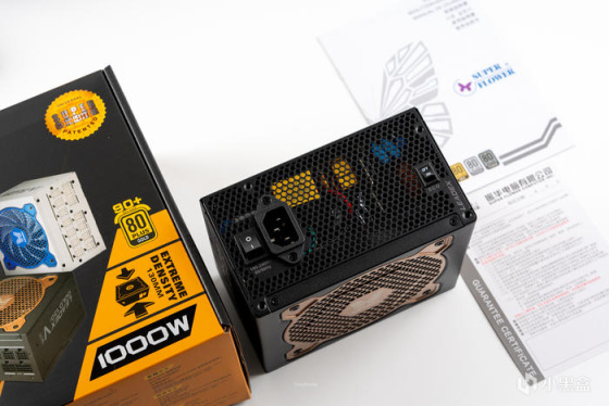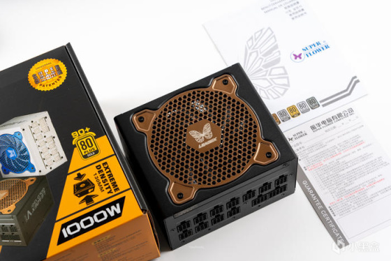 電源風扇進風口是超級花的logo,金牌則使用了金色設計,內部的12cm風扇則採用11葉FDB設計,45%負載下風扇停轉運行