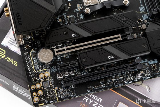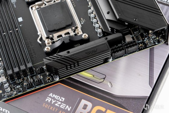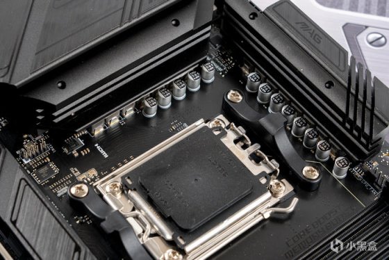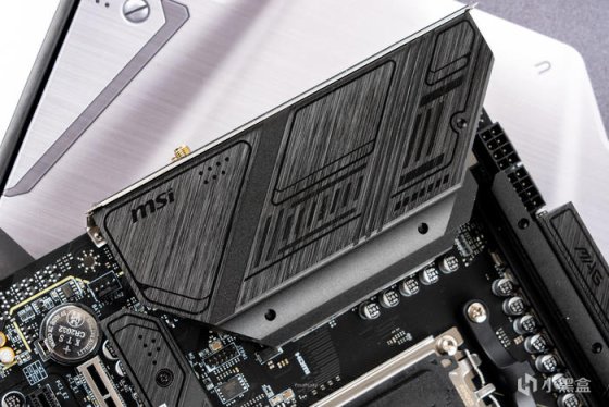 一體化的全覆蓋擴展型VRM散熱片,在靠近CPU處做了弧度斜切下來所以風冷的兼容性應該還好,散熱片上做的黑色拉絲效果也比上一代鋁原色更有質感了,點綴一個MSI的logo,拉絲效果區域可以使用附件裏的軍事風格貼紙裝飾