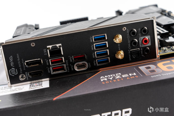 後置接口方面,這裏依次爲FLASH BIOS無憂刷機按鈕,HDMI2.1和DP1.4滿配的集顯接口哦,還有2.5GLAN,3個USB3.2GEN2 10Gbps和一個TYPE-C,四個USB3.2 GEN1 5Gbps,WIFI6E藍牙5.2