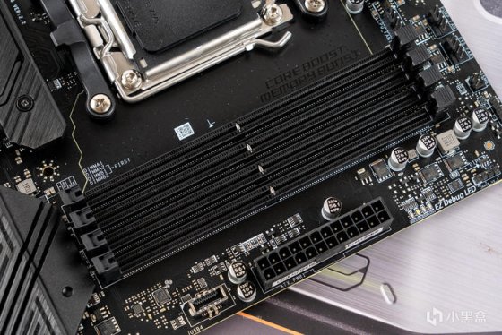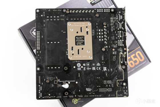 主板的背面,右下角有六層板標識,而內存採用新一代的SMT貼片工藝增強了電氣性能,而且第一條PCIE4.0也是同等工藝,AM5的背板面積也比較大覆蓋了四角的螺絲孔位