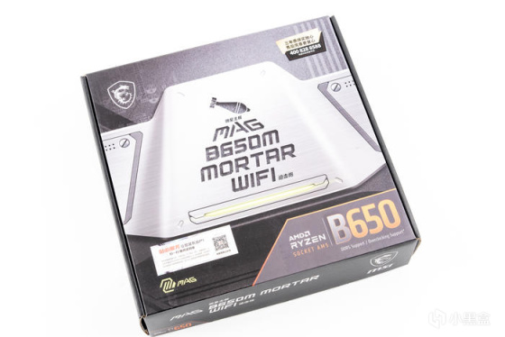 微星的MAG B650M MORTAR WIFI 迫擊炮主板還是一貫的灰色的軍事風格包裝,中間是型號標識,左上角微星LOGO,右下角則是RYZEN AM5的B650可超頻芯片組