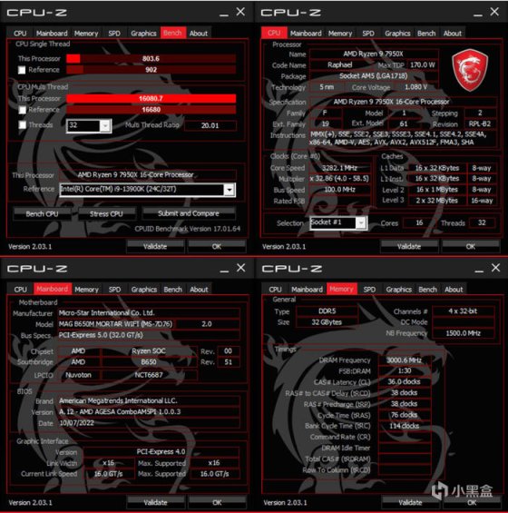 CPUZ 測試16大核的7950X的單核803.6分,多核16080.7分,雖然單核遜色於13900K很多,但是得益於純16個大核心,多核成績也基本持平於13900K