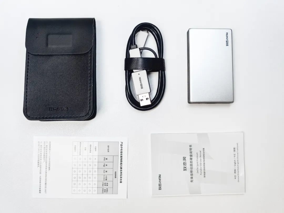 包装盒的尺寸继续开盒。可以看到除了致态灵·先锋版移动固态硬盘主体和保修卡、使用说明外,还有一个收纳包、一根双C口加USB-C转USB-A的二合一数据线。