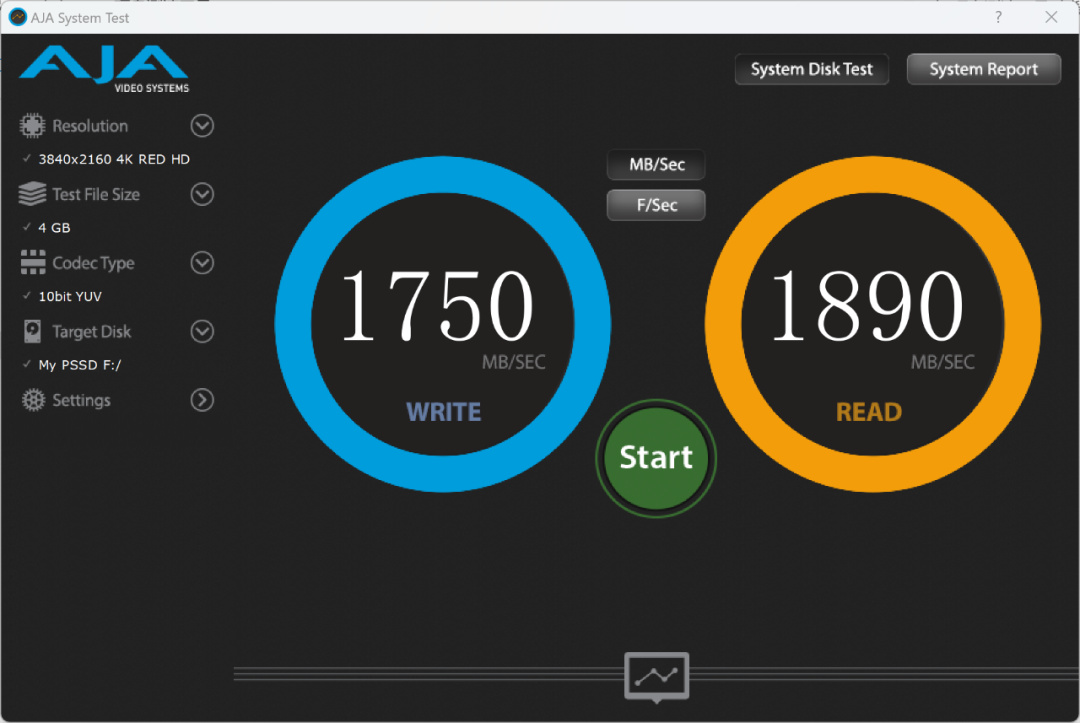 AJA_SystemTest是一款可以模拟分辨率对硬盘速度进行测试的测速工具,相对来说规则更为苛刻,所以结果会更接近实际传输表现,用其对致态灵·先锋版移动固态硬盘测速,读写速度分别为1890MB/s、1750MB/s,表现很亮眼。