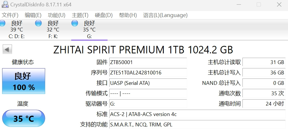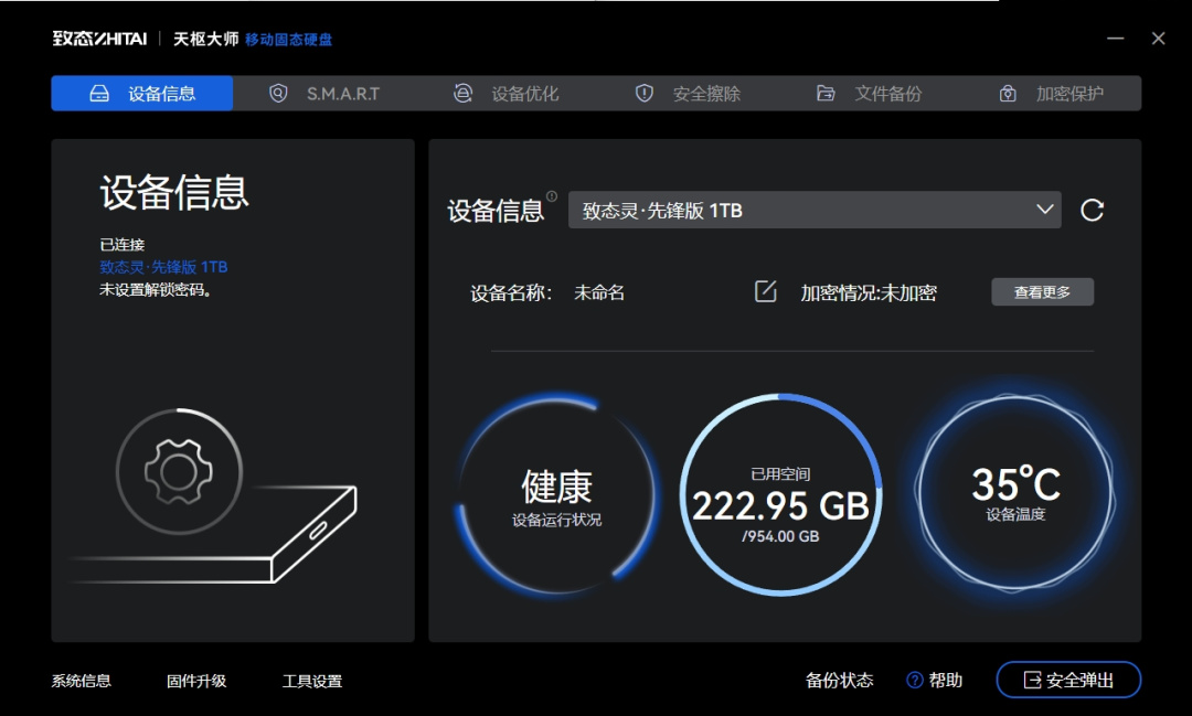作为致态官方的移动固态硬盘诊断和维护工具,天枢大师可以用来监控移动固态硬盘状态、查看相关信息、进行固件升级等。
