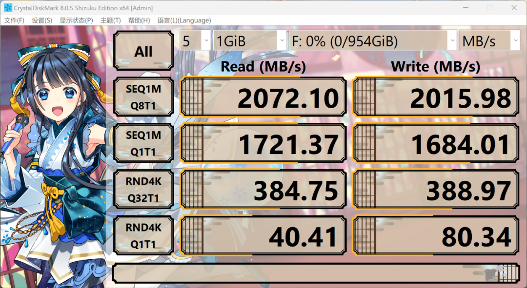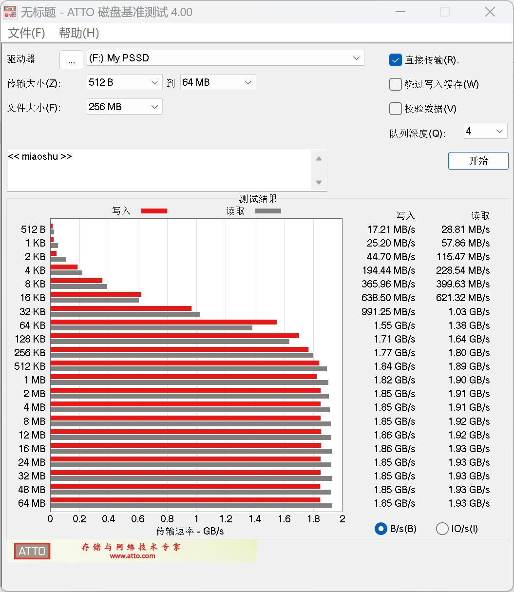 用 ATTO Disk BenchMark 测试传输不同大小文件的速度表现情况,可以看到传输大小达到64KB后读写速度均超过1GB/s,最高写入速度达1.85GB/s,最高读取速度达1.93GB/s。