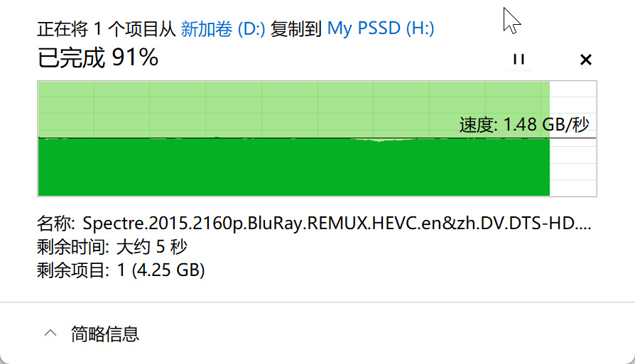 从电脑本地磁盘将文件拷贝到致态灵·先锋版移动固态硬盘,传输速度也接近1.5GB/s,整个过程同样非常稳定,像这种文件拷贝速度快且动态速率图接近直线的,只有品质非常好的硬盘才会出现,因为一般的硬盘传输速度波动通常比较大。